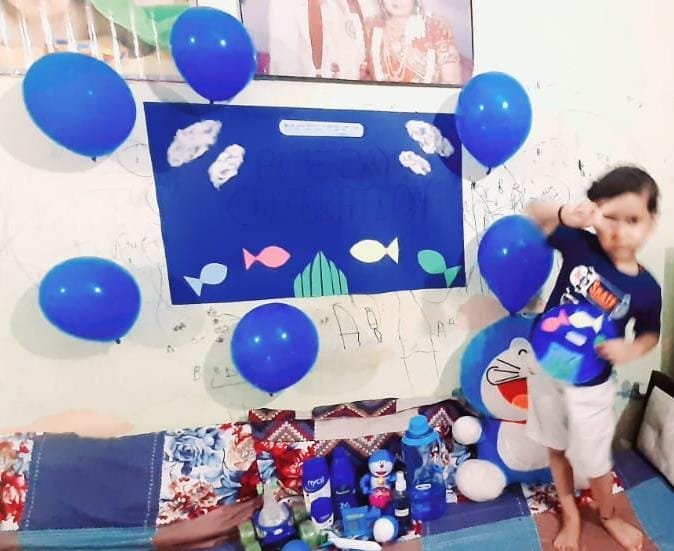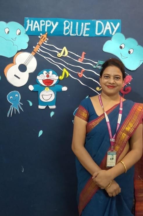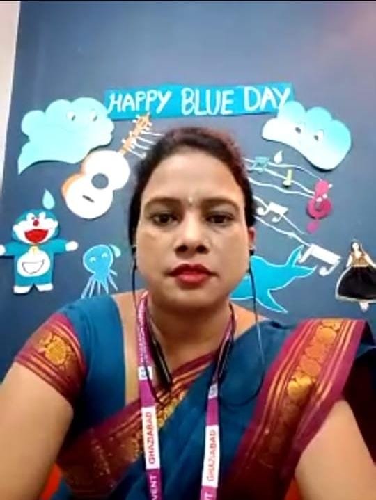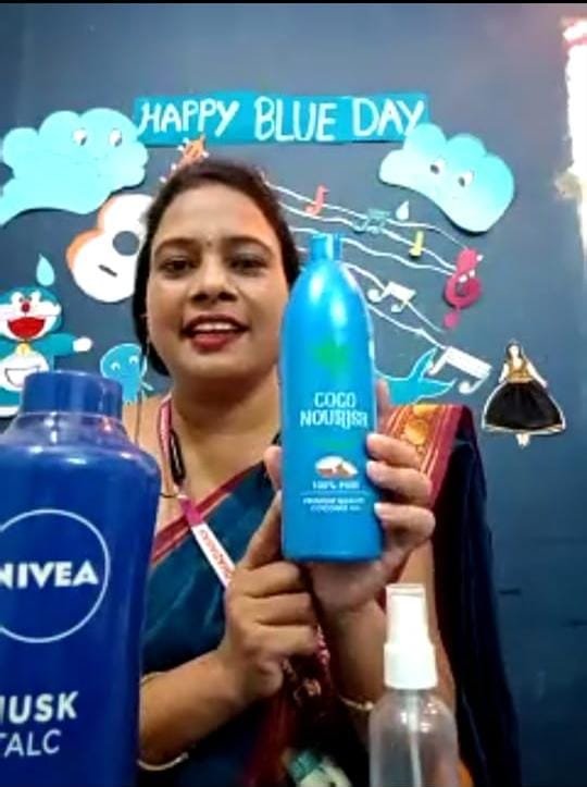 CELEBRATION OF BLUE DAY "BLUE" Is a cool & calming color that shows creativity & intelligence. Kids of nursery & K. G. need to develop ability to identify colors and differentiate among them, so an activity of blue day is organised for kids during their online classes. All the kids dressed up in different shades & hues of blue. To make the activity more inclusive, children kept different objects like toys, decorative items & drawing based on theme during their online classes. Children enjoyed the activity with great immense enthusiasm & zeal during their online classes. Teacher apprised them about the color recognition of "BLUE" with super props & perfect demo.