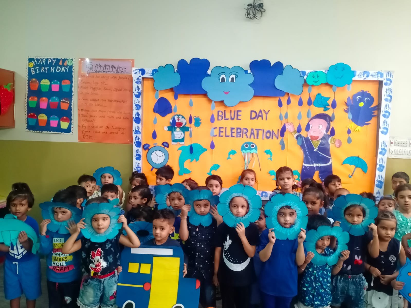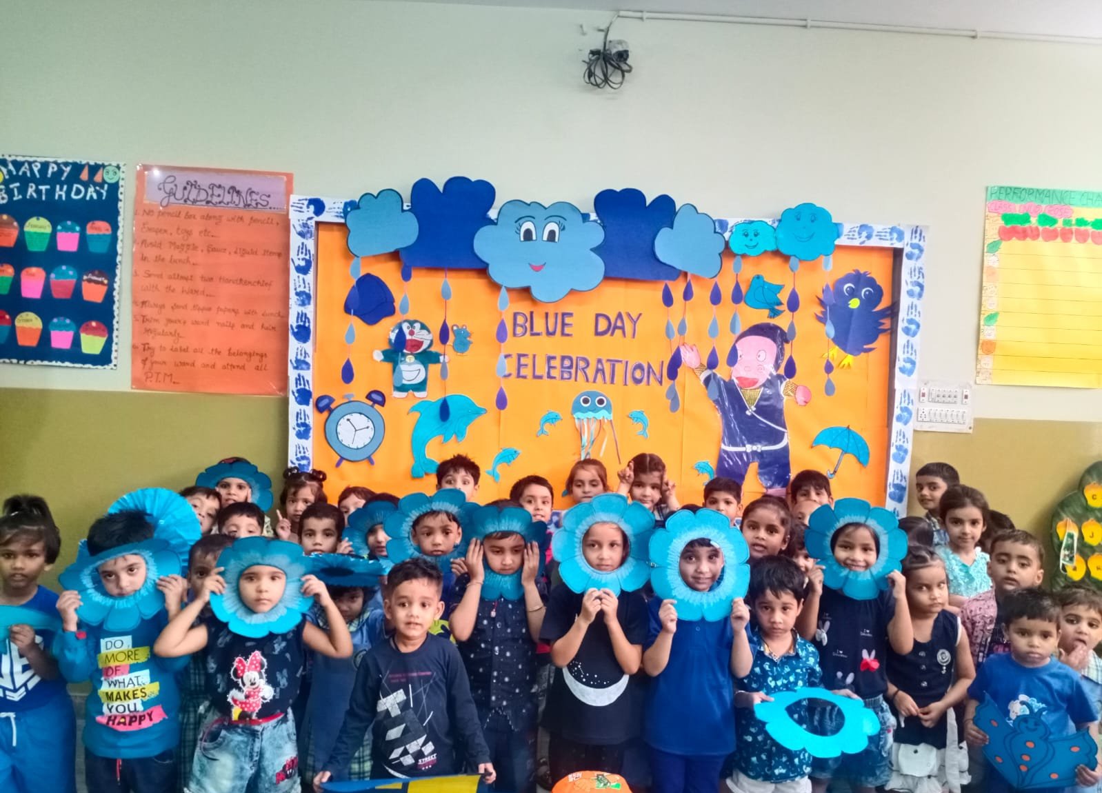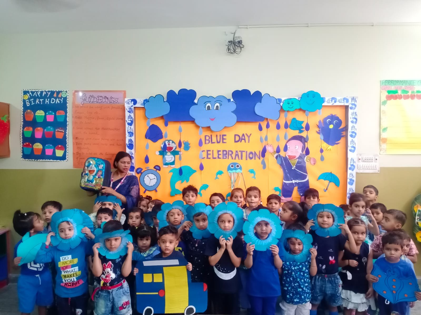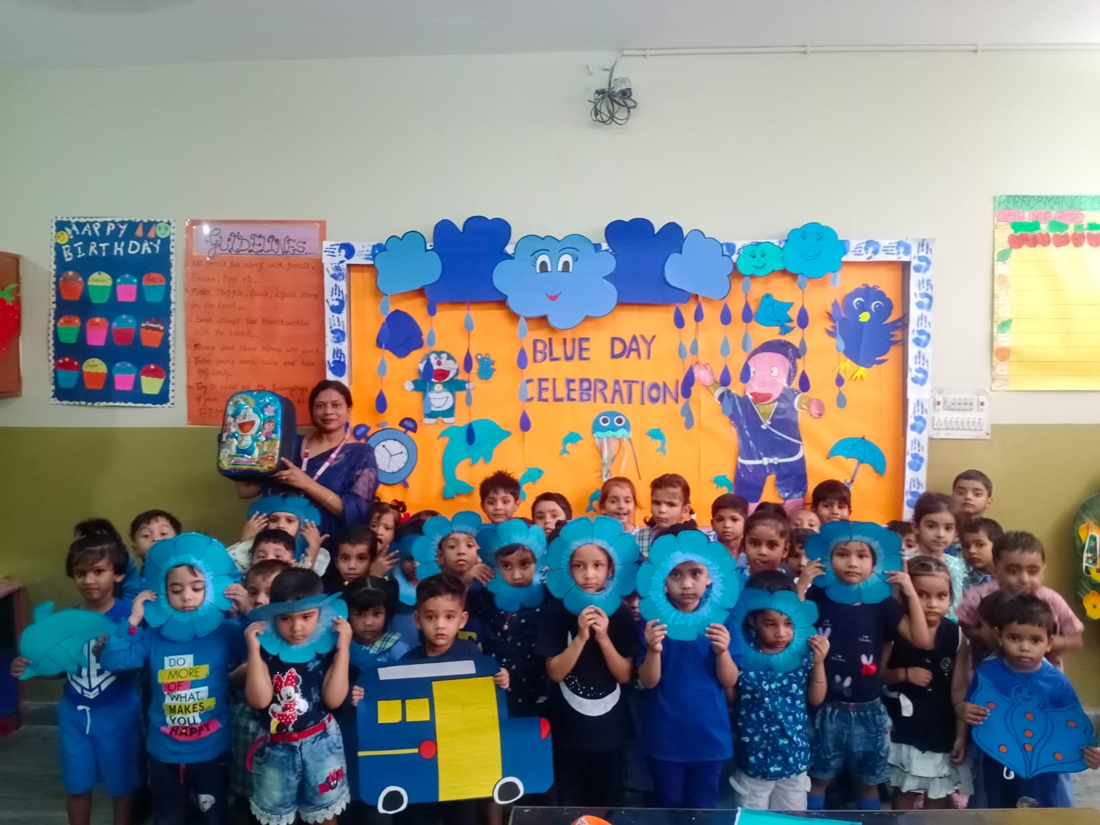 Blue Day was celebrated on __.The colour blue represents both the Sky and Sea and is associated with open spaces,freedom,imagination.Blue colour is often seen as a sign of stability & reliability .The motive of celebrating Blue Day was to make the students aware of the colour,its signficance and to develop the fine motor skills in the students to learn the colours so easily.All our little kids were dressed in Blue.It was such a great and innovative way to recognise and learn the colours.It had a long lasting effect on each student.All the students were very happy and enjoyed the activity to the fullest.