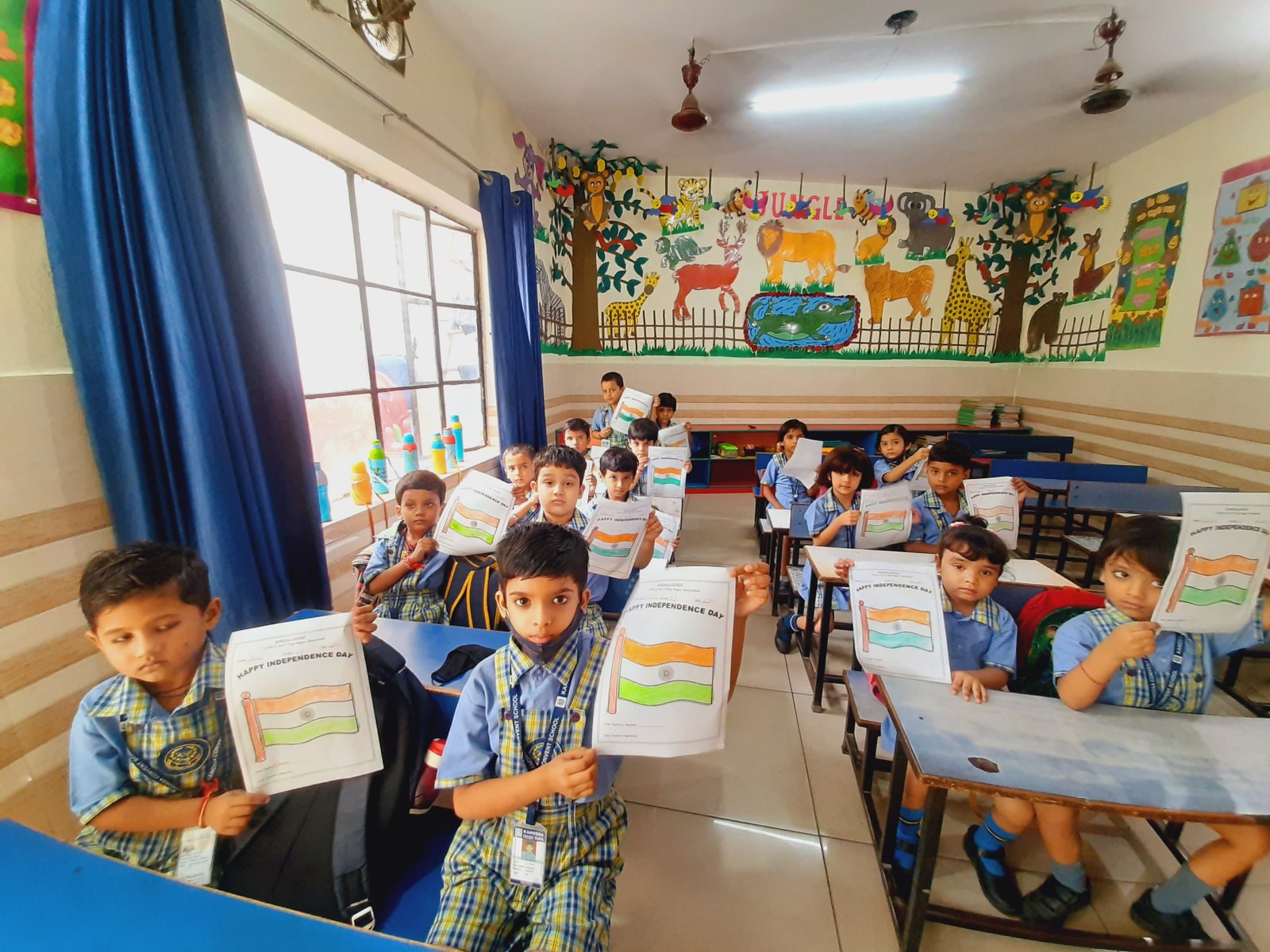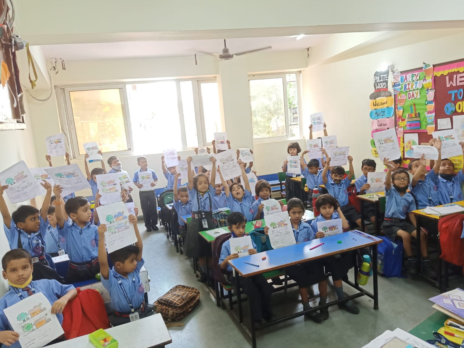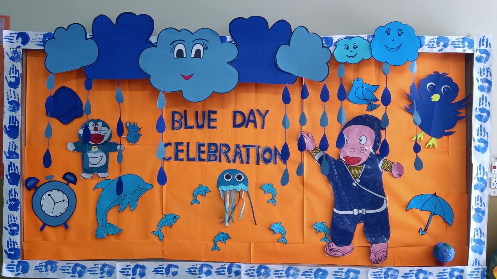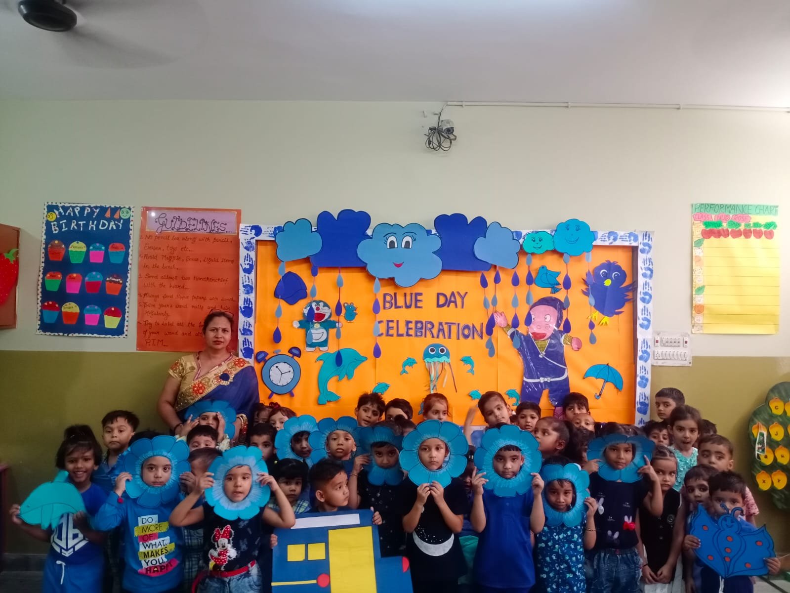 Blue Day was celebrated on __.The colour blue represents both the Sky and Sea and is associated with open spaces,freedom,imagination.Blue colour is often seen as a sign of stability & reliability .The motive of celebrating Blue Day was to make the students aware of the colour,its signficance and to develop the fine motor skills in the students to learn the colours so easily.All our little kids were dressed in Blue.It was such a great and innovative way to recognise and learn the colours.It had a long lasting effect on each student.All the students were very happy and enjoyed the activity to the fullest.