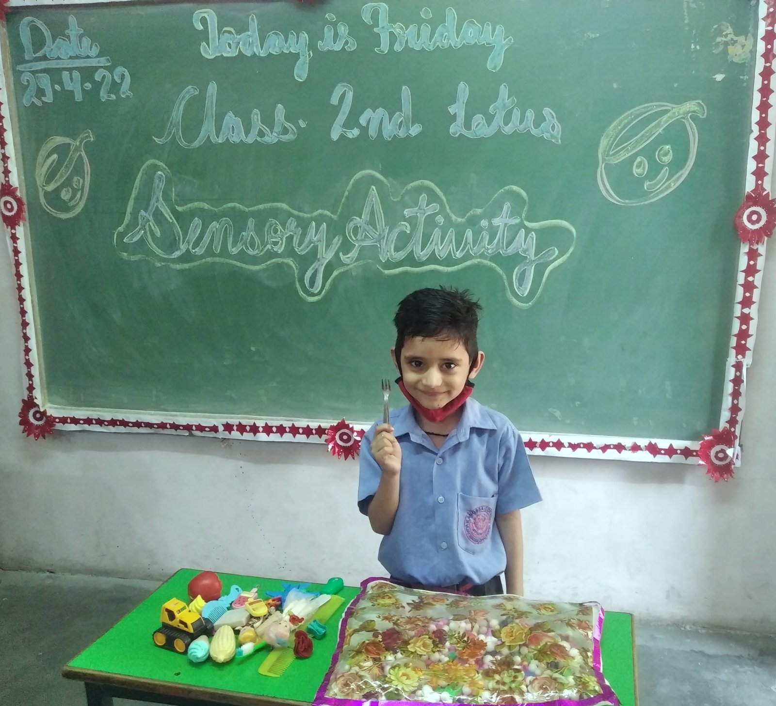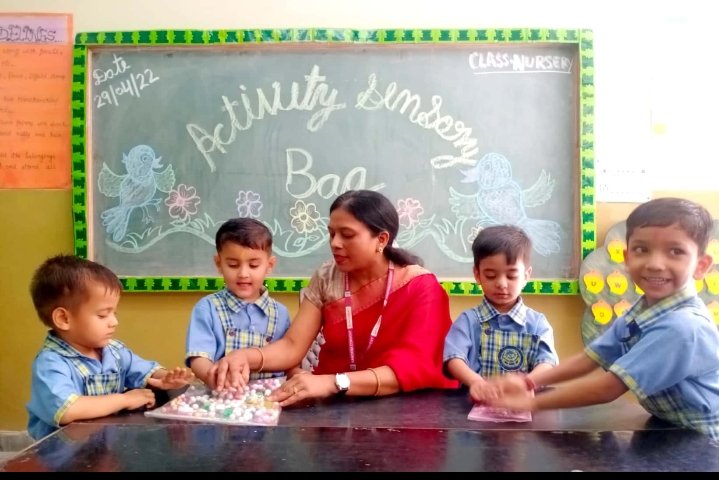 Sensory Bag Activity was celebrated on ____________ in our school.It was such an innovative activity that was conducted for our little toddlers.This activity was a beautiful blend of education with fun.As in this activity students have to identity the objects kept in a sensory bag by just sensing them with their hands only,they were not suppose to see te things and that was the main ingredient of this activity.Main motive of this activity was to make the students realise how to sense the things without viewing them by their eyes.It was really a fascinating day which add up a new and amazing experience in our student's life.They all enjoyed to the fullest.Here are few glimpses from Nursery & K.G. Class-