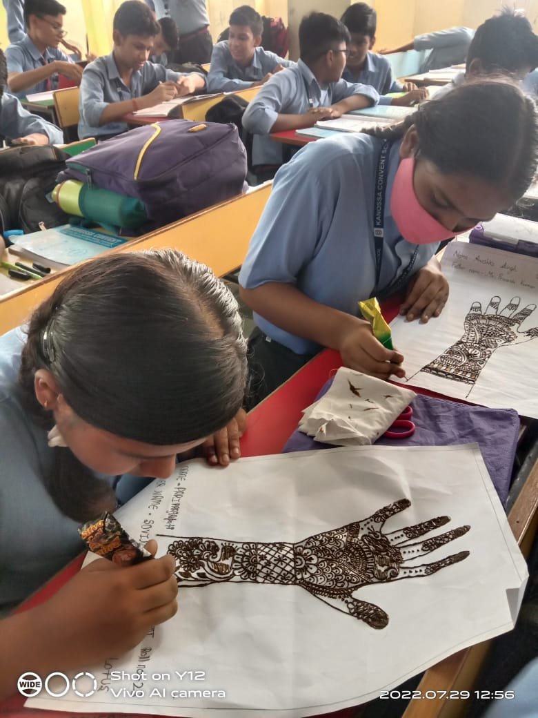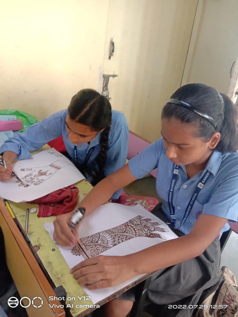 Kanoosa Convent School provided a stage to the stars of Standard VI to VIII by organising Mehendi competition on 29th July 2022. Children created beautiful designs in different themes. Mehendi reflects the rich Indian culture bringing together the knowledge of medicinal herbs with many lovely sentiments and beliefs. The result is a ceremony filled with fun and joy.