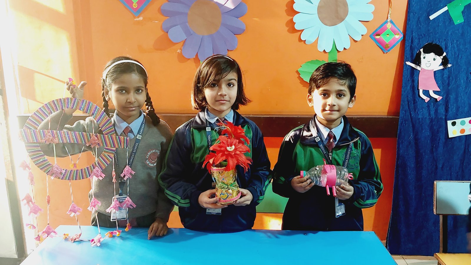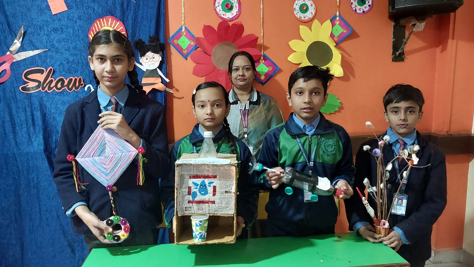 using material like newspaper, old CDs, used plastic bottles, ropes, ice cream sticks, bangles,